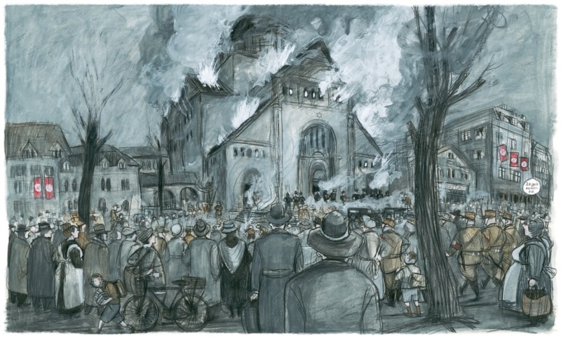 Fondamentali in questo contesto sono i colori: pastelli, matite e acquerelli vengono stesi con gettate improvvise e disomogenee, che lasciano intravedere al di sotto la struttura portante della tavola e gli schizzi che definiscono persone e oggetti. Questo dona al fumetto un’energia primitiva, che si trasforma da incorporea e poetica nei momenti più lievi a densa e materica nei passaggi più drammatici, come nella scena dell’incendio della Sinagoga o delle requisizioni dei beni degli ebrei.