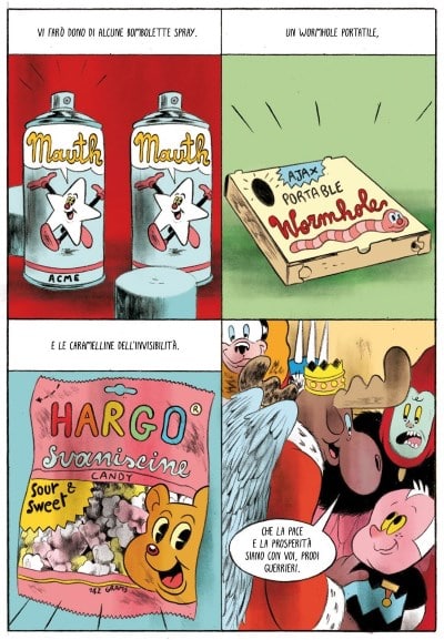 Il modo di comunicare arriva dalle campagne di Dungeons & Dragons che facevo con mio fratello e i miei amici e poi anche di un gioco a tema supereroi che avevamo inventato noi, perché D&D aveva troppe regole. Il linguaggio era quello: innanzitutto, per far prima, ci si chiamava con i nostri veri nomi e questo è rimasto dentro Dogmadrome, diventando così un modo per banalizzare i personaggi; in secondo luogo, il dire le parolacce fa capire al lettore che c’è questa specie di scarto tra quello che vede e quello che loro sono realmente, ovvero dei ragazzini che parlano come fanno ogni giorno. Inoltre i protagonisti, nella loro natura di giovani adolescenti, parlano citando quello che hanno visto o letto, quindi film, libri e anche videogiochi.