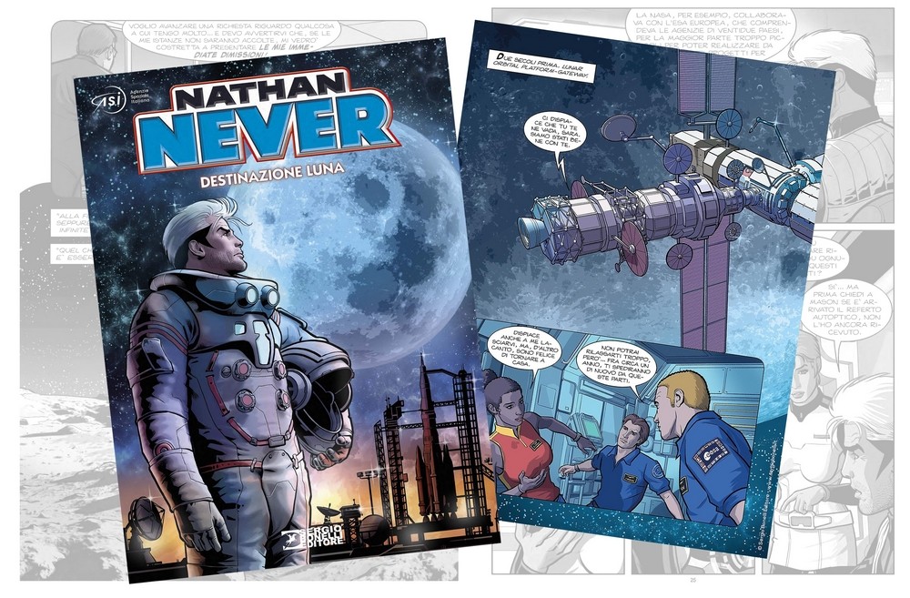 La grande differenza è che in Stazione Spaziale Internazionale, lo spunto per far incontrare Nathan Never con un personaggio realmente esistente, l’astronauta Luca Parmitano, era un portale spazio—temporale, che permetteva al nostro eroe di tornare indietro nel tempo. Era un escamotage fantascientifico per incrociare la tecnologia reale del nostro presente (la Stazione Spaziale Internazionale) con quella futuribile dei fumetti di Nathan. Qui, invece, lo spunto potremmo definirlo “fantarcheologico”: Nathan nel corso di una sua indagine nella sua epoca, si trova a dover far luce su un segreto legato alla costruzione della prima base lunare.