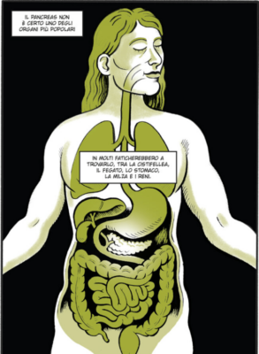 Pancreas è un fumetto a più mani e ibridato da diverse maestranze, che possiamo dividere in due parti: la prima, dedicata propriamente al pancreas, nella quale viene presentato l’organo, sia nell’esplicazione delle principali funzioni che nel ruolo mediatico e sociale presso il grande pubblico. Meno famoso di altri organi, quali il cuore e persino i polmoni, è tuttavia una parte fondamentale della nostra vita, di cui si scopre l’importanza quando, paradossalmente, smette di funzionare bene o viene colpita da un problema che ne limita le funzioni.