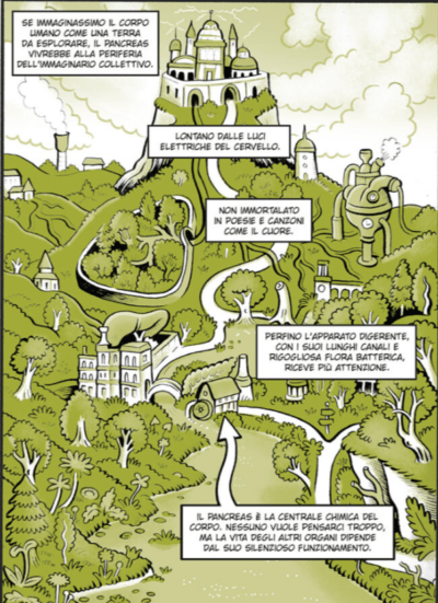 Stesso discorso vale per gli artisti che si sono prestati allo studio del pancreas e delle sue funzioni, alla messa in scena delle vite dei narratori e alle caratteristiche anatomiche dell’organo: questi lavori sono la prova che l’arte può rendere intellegibile e chiaro anche il discorso più astruso, che persino un organo può entrare a buon diritto in un fumetto.