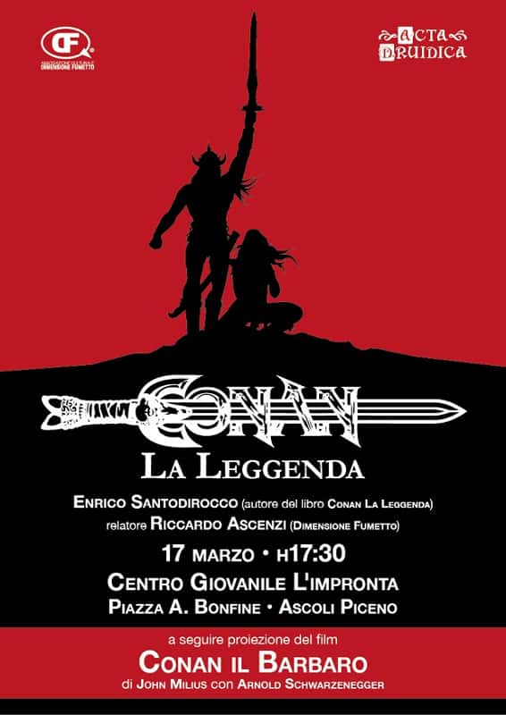 Sabato 17 marzo ad Ascoli Piceno, presso il centro giovanile L’Impronta, Dimensione Fumetto e Acta Druidica presentano Conan: La Leggenda, il saggio di Enrico Santodirocco dedicato al barbaro nato nel 1932 dalla penna di Robert E. Howard.