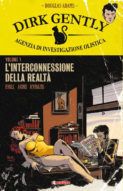 Nata sotto la supervisione di Arvind Ethan David – autore e produttore la cui carriera esordì sotto l’ala protettiva proprio di Douglas Adams –, scritto da Chris Ryall (CEO e Editor in chief della IDW) e disegnato da Tony Akins (Aliens, Tales of Jedy, Fables, Hellblazer) e Ilias Kyriazis (artista di origine greca molto conosciuto in madre patria), l’elemento distintivo del fumetto di Dirk Gently è il porsi quale trait d’union tra la versione letteraria e quella televisiva statunitense del personaggio.