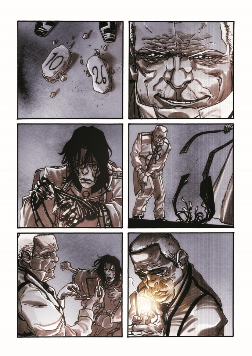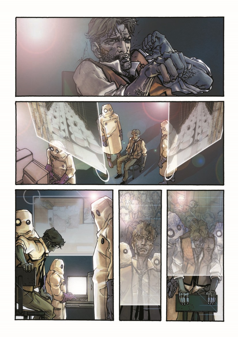 Questa è la trama di una storia narrata con maestria dai due autori, un plot che riporta alla mente altre grandi storie ucroniche dal già citato “V for Vendetta” di Moore al “1984” di Orwell 2 o il “Brazil” di Gilliam 3 . Ma la particolarità de la Dottrina nel panorama fumettistico italiano sta nella complessità dell’opera che va oltre la trama e si presenta ricca di spunti, citazioni e profondità narrativa che prevaricano il mondo del racconto disegnato ed attingono a piene mani alla letteratura. I diversi livelli di lettura possibili portano di volta in volta a scorgere richiami più o meno velati, dalle citazioni futuristiche all’inizio di ogni capitolo alle storie proibite che i personaggi si sussurrano, per le quali Alessandro Bilotta ha scelto di utilizzare la trama di quelle che noi sappiamo essere note poesie, e che trasformate invece in pensieri vietati rafforzano l’idea di volontà di sognare che quel regime proibisce. Il futuro narrato da Bilotta è imperfetto ed indesiderabile, ma nella lettura dell’opera affiorano a tratti dei segni chiari e riconoscibili del nostro presente, e quegli inganni dell’Interno per controllare e gestire quelli che nella narrazione non sono più cittadini ma sudditi, se non schiavi, hanno un chiaro riferimento a quei giochi di potere più o meno velati che quotidianamente quasi non osserviamo più, e questo aspetto probabilmente rende la narrazione ancora più mordente.