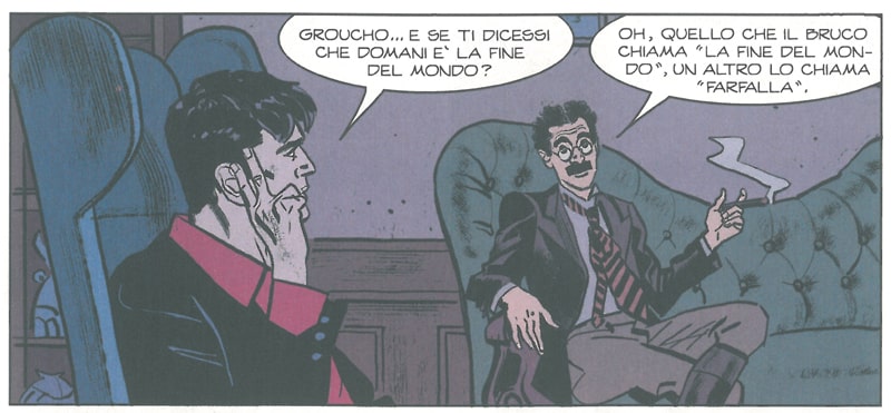 Ma la frase che più di tutte può forse fungere da chiave di lettura all’intera vicenda è probabilmente quella pronunciata da Groucho quando dice: «quello che il bruco chiama la “fine del mondo” un altro lo chiama farfalla». Punti di vista differenti dunque, due antipodi, di cui comunque uno prevarrà (presumibilmente, vista anche la teoria fisica riportata in chiosa al volume dallo stesso di Sclavi).