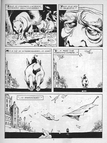 Il signore del silenzio, uscito nel dicembre del 1989, a firma di Giuseppe Ferrandino, per i disegni di Giampiero Casertano. Il signore del silenzio, nonostante non sia scritto da Sclavi, creatore del personaggio, è l’episodio che ci consente di avvicinarci più intimamente alla Weltanschaung dylaniata. Che dietro la Verità (con la “V” maiuscola), scoperta da Uskebasi, il signore del silenzio, filosofo ai tempi di Salomone, re d’Israele, si celi null’altro che un atroce scherzo. Che la stessa vita non abbia senso, questo lo avevamo intuito sin dai primi numeri di Dylan Dog. Manzocco ci aiuta, ancora una volta, ad ancorare tale nichilismo esistenziale ai pensatori corretti. La correlazione che ci suggerisce l’autore è quella con il pensiero esistenzialista francese di Albert Camus e Jean-Paul Sartre, di cui Uskebasi diviene una sorta di precorritore, infinitamente più incisivo, dal momento che la lettura del suo tomo, costringe il malcapitato lettore al suicidio (non mi risultano postumi di tal genere dalla lettura de La nausea, ma magari qualcuno ci sarà pur andato vicino).