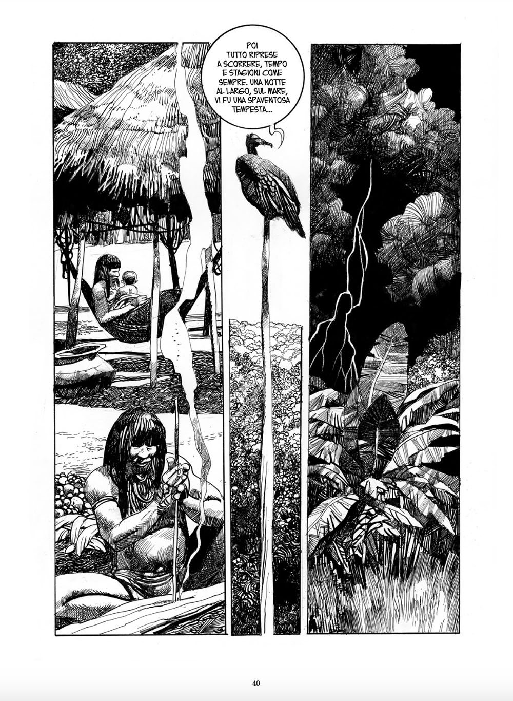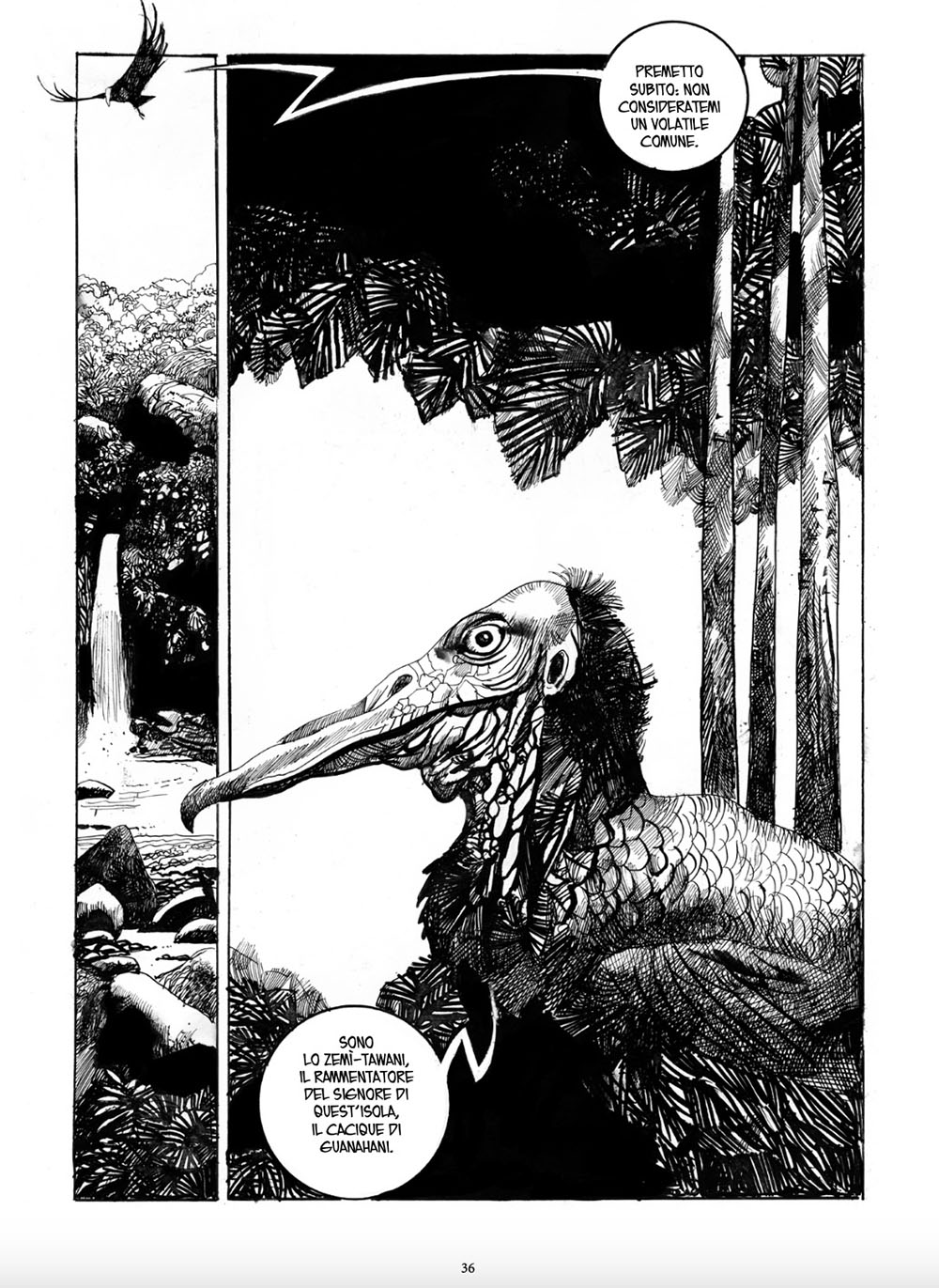 Al contrario, in Ipotesi 1492, l’impresa di Cristoforo Colombo viene riletta attraverso una lente grottesca e amara. Qui, l’unico superstite del naufragio delle caravelle, Rodrigo de Triana, approda a Guanahani carico di speranze di gloria, solo per ritrovarsi prigioniero di un gioco crudele di equivoci con i nativi e con lo spirito Zemì-Tawani.