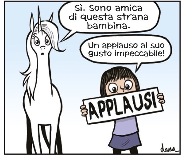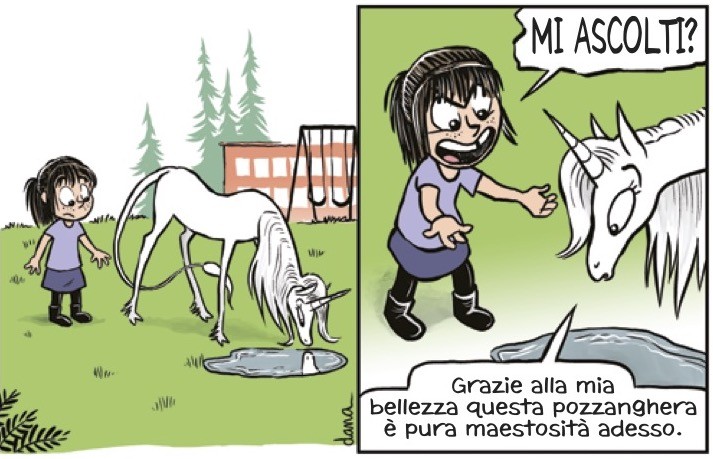 Emma e l’Unicorno è anzi molto realistico, riproponendo situazioni non insolite per un’adolescente: le sensazioni e le emozioni di Emma vengono rappresentate per come sono, e appaiono più che legittime. Ciò che è insolito è invece il modo che hanno le due amiche di affrontarle, con genuina umanità e molta ironia, che non smorza i toni e, anzi, amplifica la capacità di questo fumetto di far pensare, offrendo più livelli di lettura. Se infatti gli aneddoti regalano già di per sé molto materiale su cui il lettore può riflettere, il sarcasmo di cui sono spesso infarciti aggiunge un ulteriore livello di profondità, che sposta l’asticella un po’ più in alto, ampliando il raggio d’azione della narrazione. Le battute divertenti che vengono proposte non si rivolgono solo a un pubblico giovane: i livelli di ironia che possono raggiungere i dialoghi di questo fumetto sembrano essere talvolta molto più elaborati e raffinati, indirizzandosi anche a lettori più maturi e attenti.