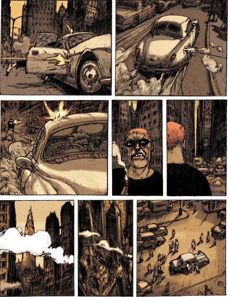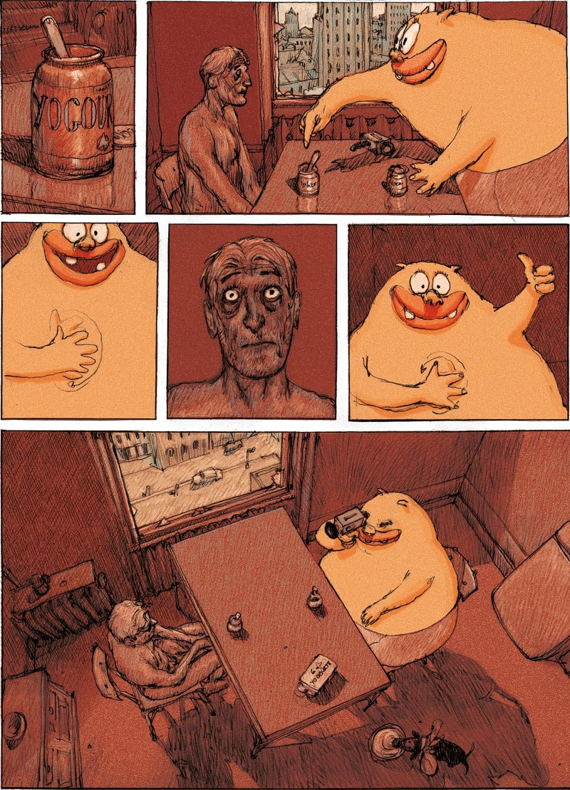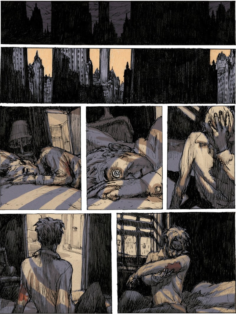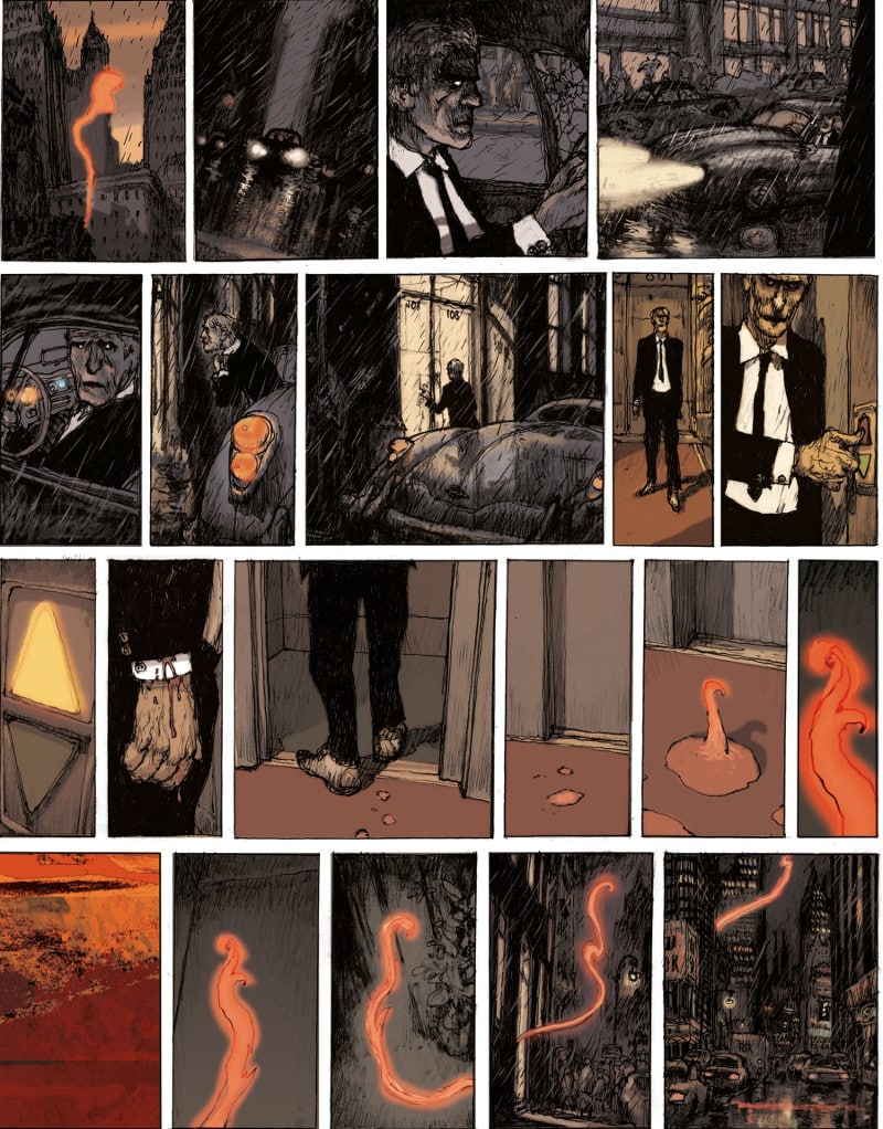Nicolas de Crécy crea un’inquietante favola metropolitana dove il noir e il grottesco si fondono in una wordless novel, e dà vita a un’esperienza di rara intensità espressiva grazie al suo stile pittorico unico e inconfondibile e attraverso una serie di vignette claustrofobiche.