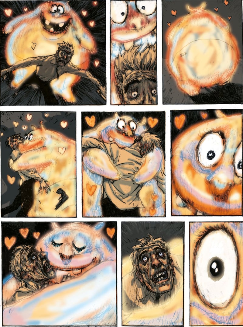 La storia si apre con un omicidio: un uomo viene assassinato per strada, il killer ferito scappa per i vicoli bui di una metropoli oscura, che ricorda la New York-sur-Loire de Il Celestiale bibendum. Mentre l’assassino cerca rifugio, tra i grattacieli spettrali sangue, fumo e fluidi corporei si fondono dando vita a un essere cartoonesco dalle sembianze femminili. Una creatura gigantesca, buffa e incontrollabile, che incarna il rimorso e la vendetta, si catapulta nella vita del killer. Senso di colpa e ricordi dolorosi si mescolano nella vita del protagonista e la presenza della creatura si fa sempre più ingombrante e asfissiante, infestando le sue giornate che trascorrono come un incubo a occhi aperti.