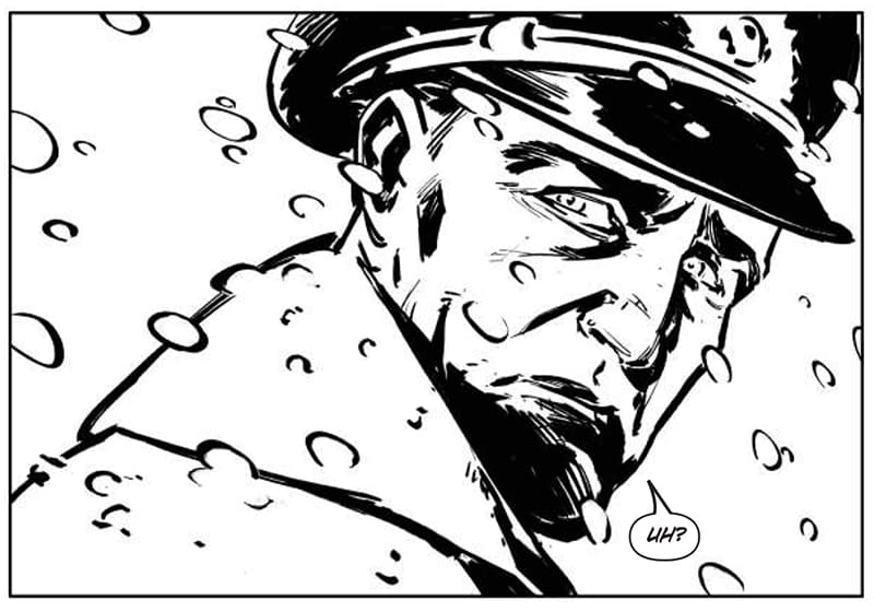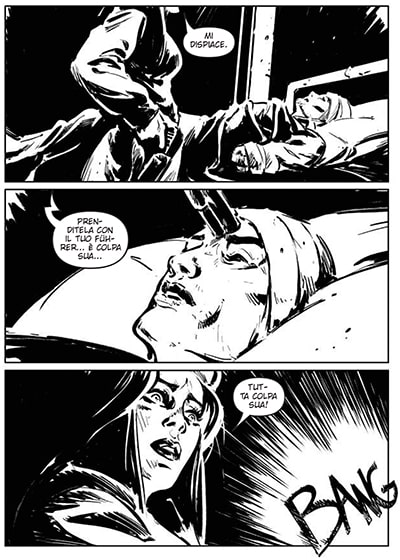 Pur essendo frutto della fantasia dello sceneggiatore, il momento è carico di pathos – spezzato tuttavia da alcuni dialoghi in eccesso e dalla sequenza dell’amputazione della gamba che è ormai un must in quasi tutte le scene ambientate in un ospedale da campo – e appare assolutamente plausibile in un qualunque contesto bellico. Qui Befani ha caricato la tavola di ampie campiture nere e di una cura per i particolari, soprattutto nel disegnare i volti dei personaggi, che rendono il momento fortemente drammatico ancora più carico di peso emozionale.