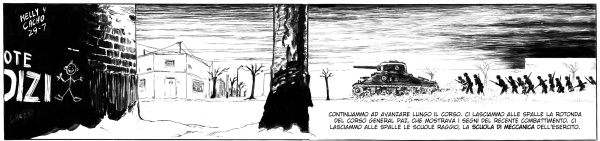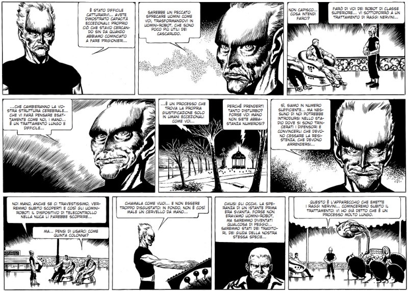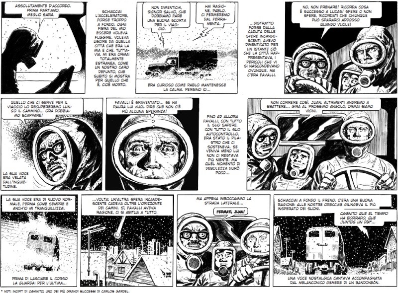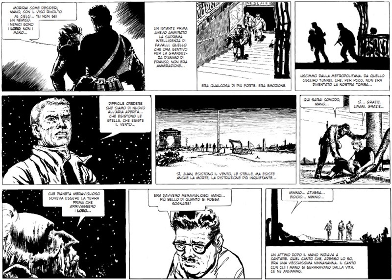 Ne avevo parlato con Solano per chiarire con lui come rendere ogni singola tavola: si decise di operare l’annerimento delle parti scure, delle masse, perché quello era il suo intendimento originario. Si sono mantenuto invece tutti i dettagli dei volti e dei corpi in movimento. Poi ogni vignetta ha avuto la sua storia.