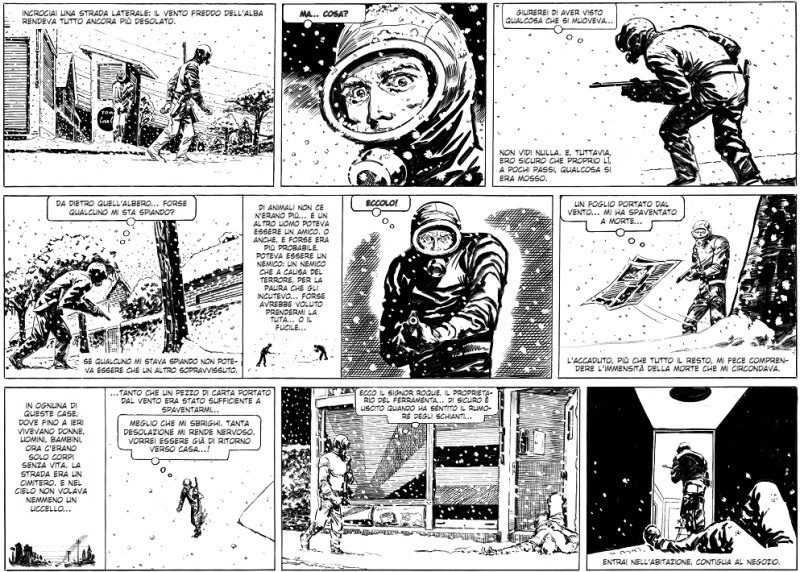 È il momento in cui il racconto può avviarsi. Una sera, nel chiuso della sua casa, mentre è intento a giocare a carte con gli amici, colui che viaggerà nel tempo, assiste alla prima manifestazione di un’invasione aliena: una neve fosforescente, che in poco tempo uccide quasi tutti gli abitanti di Buenos Aires. Comincia l’incubo. Diverso, però, rispetto al terribile futuro previsto dalla letteratura e cinema distopici dei decenni del dopoguerra. Oesterheld lo riscriveva in modo più consapevolmente militante, per questo non tralasciando barlumi di speranza.