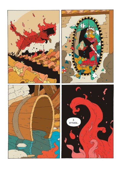 Il ritmo veloce e spedito che caratterizza l’intero volume viene definito fin dalle prime pagine: si comincia con delle fiamme che squarciano un fondo nero, con quattro vignette regolari che presentano i primi dettagli di un assedio (un gatto in fiamme che salta, una vetrata che si frantuma), che poi deflagra nelle pagine successive con alternanza di campi larghi e di riprese ravvicinate: poco testo, solo il necessario per presentare alcuni elementi della vicenda, mentre tutto il resto è occupato da un’azione incessante, che guida velocemente l’occhio da una parte all’altra della pagina, travolgendolo.