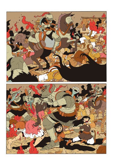 Questa costante contrapposizione tra conflitto e quiete si rispecchia nei disegni e nella costruzione del ritmo narrativo di Pace, veri punti di forza di questo volume. L’autore di Rieti aveva dato prova della sua bravura nel creare scene di battaglia maestose in Anguisomachia (Barta Edizioni), allegoria del terremoto come battaglia tra l’uomo e una forza primordiale della terra. Fiaba di Cenere rappresenta una conferma di questo talento grafico: scene potenti, ricche di dettagli e di dinamismo, che guardano tanto a oriente (in particolare alla cinecita’ di Berserk di Kentaro Miura) quanto a occidente (un tratto solido e netto, corposo e denso da fumetto sudamericano), si animano di battaglie piene di corpi in continuo movimento, di colpi che fanno sentire tutto il loro peso quando vengono sferrati. Anche i design dei personaggi sono studiati con grande attenzione: esempio massimo è l’esercito del fuoco, sempre compatto come un’onda inarrestabile, fatto di armature che impediscono di vedere chi si celi al proprio interno, capace di incutere fin da subito un terrore subdolamente affascinante.