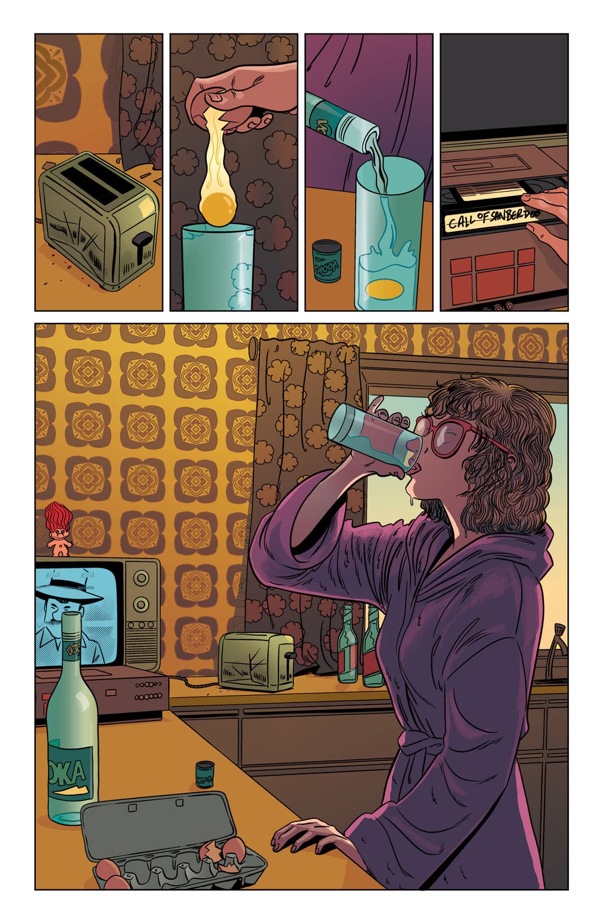 Ci sono tuttavia anche un paio di elementi riusciti. In primo luogo una gestione parsimoniosa dei dialoghi, inframezzati da lunghe sequenze mute, che danno alla narrazione un tono riflessivo e favoriscono la rapidità di lettura. Inoltre i disegni riescono a trasmettere un’atmosfera davvero peculiare, quasi onirica, laddove un tratto orientato al minimalismo e una colorazione sgargiante, giocata in larga parte sulla contrapposizione dei toni del blu e dell’arancione, conferiscono al fumetto un look pop decisamente accattivante.