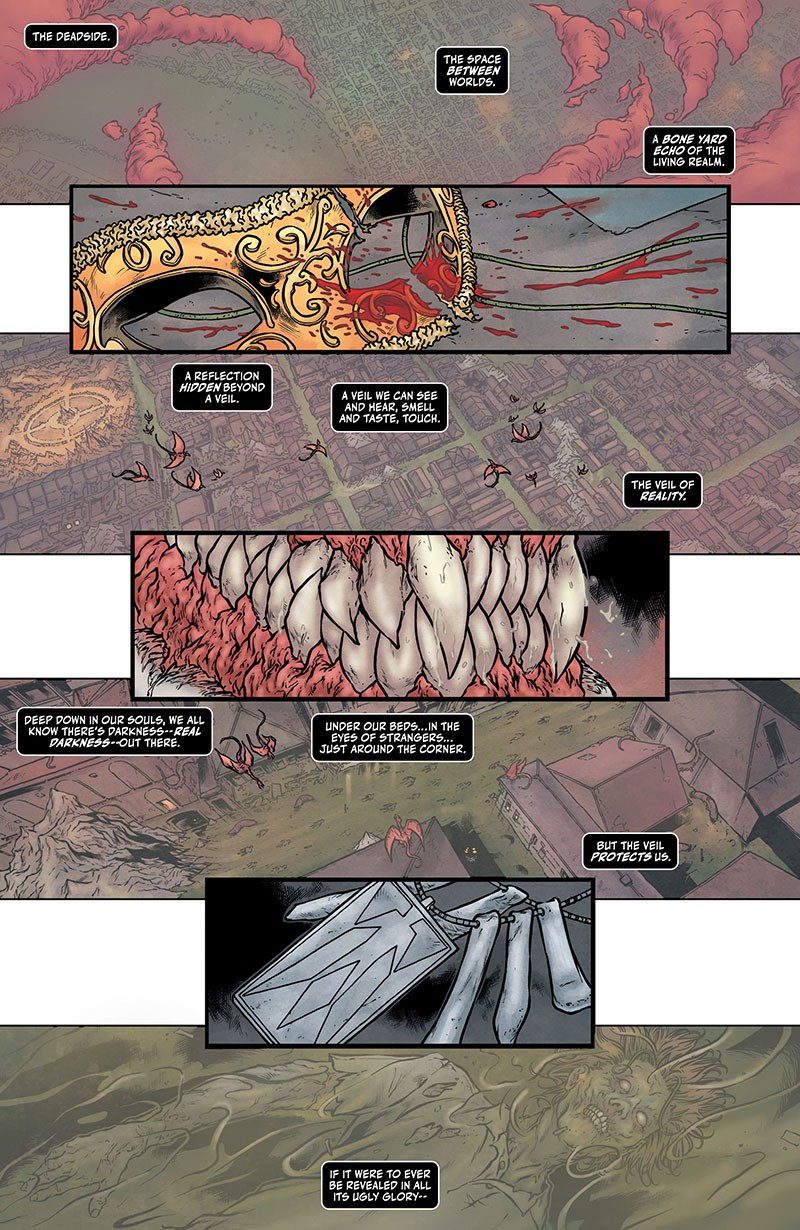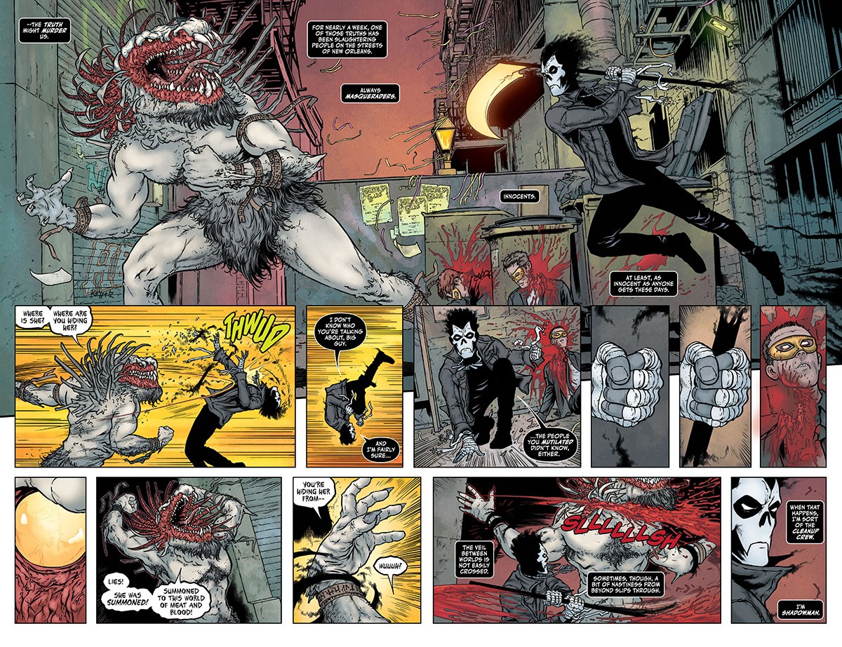 Cullen Bunn siede nella cabina di regia per questo nuovo debutto, sceneggiando con passione una buona storia che ripropone le tematiche salienti del personaggio, avvolto da un particolare alone di mistero. Grazie a una scrittura congeniale a tematiche horror e mistery, l’autore mette efficacemente in scena un nuovo capitolo della lotta contro le forze del male dello Shadowman Jack Boniface, un musicista di New Orleans che posseduto da un “Loa”, un violento spirito del voodoo, diviene un oscuro protettore del nostro mondo contro l’invasione di demoni provenienti da un’altra dimensione, dalla quale siamo separati solo da un impalpabile velo. La barriera in questione si sta ora indebolendo, rischiando di consentire a vari abominii e nefandezze di giungere sulla terra.