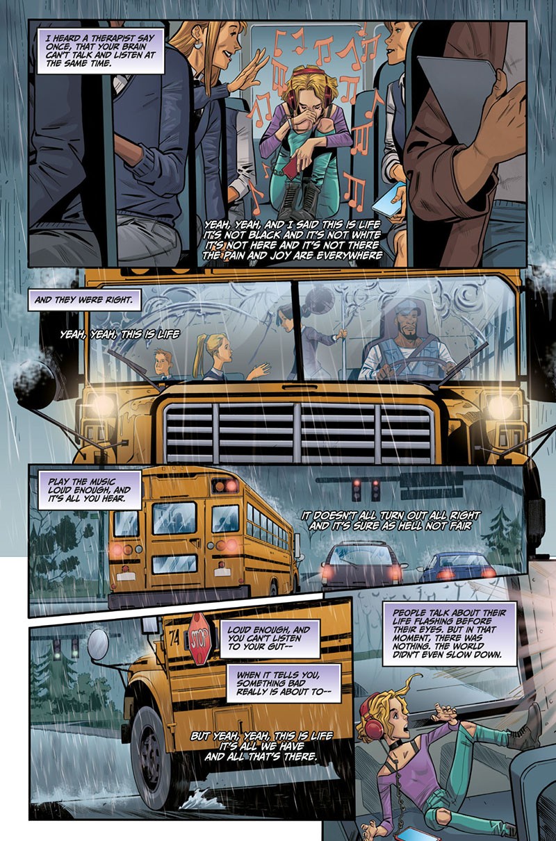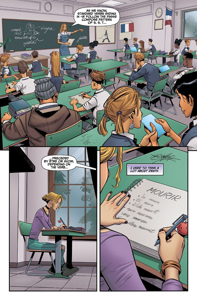 L’albo scorre velocemente e, nelle sue poche pagine concentrate su Charlotte, trasmette il crescendo di disorientamento, ansia e paura che travolge la ragazza. L’atmosfera generale è creata principalmente dalla freddezza dei colori, rispetto alla quale risalta per contrasto l’espressività dei volti; il ritmo delle scene nasce direttamente dalla costruzione delle tavole, sostanzialmente a griglia regolare con piccoli inserti o sovrapposizioni, che rendono l’eventuale concitazione del momento senza pagare dazio alla staticità complessiva del disegno, evidente ad esempio nella sequenza del viaggio del pullman scolastico e dell’incidente. In definitiva, un piccolo assaggio molto interessante: da capire se e quanto sarà apprezzabile senza conoscere le vicende dei romanzi.
