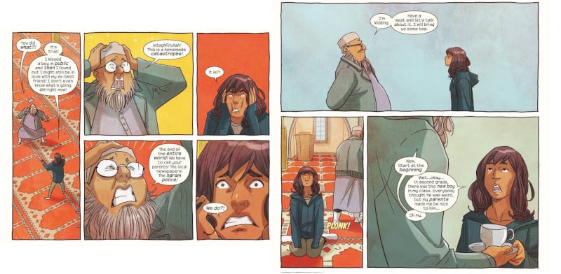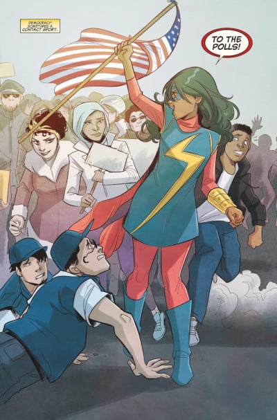 Al tempo stesso, Wilson crea un affresco culturale denso e complesso, che rifugge spesso i facili cliché e che cerca di mettere in mostra una società sfaccettata, fatta da individui sfaccettati. La comunità diventa protagonista tanto quanto Kamala, e si creano così piccoli spazi di approfondimento e di riflessione. Solo per citare alcuni momenti della seconda serie (nata dopo Secret Wars e ufficialmente definita Vol. 4), vediamo Kamala viaggiare a Karachi per conoscere le sue radici e parlare di cultura e religione (Vol. 4 #12), la vediamo struggersi per un bacio e una situazione sentimentale complicata con l’imam della sua moschea (Vol. 4 # 29-30), abbiamo il coming-out di Zoe nei confronti di Nakia durante lo scontro tra Ms. Marvel e un virus informatico che spiattella su internet contenuti personali (Vol. 4 #14-17). Si parla di diritto al voto, di privacy, di integrazione e comunicazione tra persone con idee diverse (Vol 4. #19-22); si parla di famiglia e di affetti, si parla di amore e di responsabilità, di comunità e di una idea del presente (e del futuro).