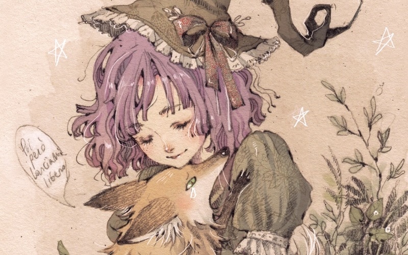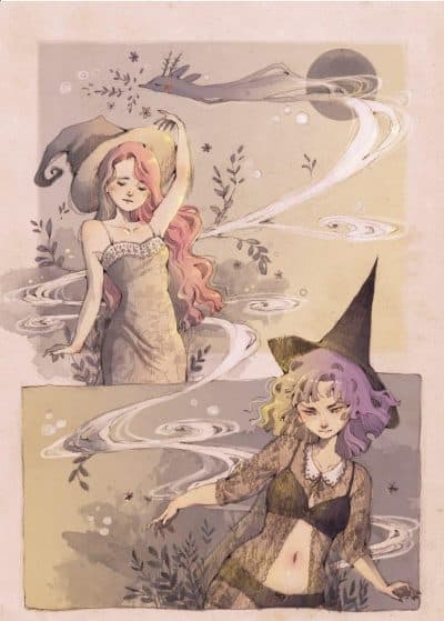 Detto dell’atmosfera fiabesca, non passa inosservato il fatto che questa sia trasmessa soprattutto grazie all’arte di Jessica Cioffi, il cui talento si materializza in ogni pagina. Gli ingredienti per la pozione sono stati selezionati con cura: un tratto dolce, ma versatile nel momento in cui, senza rinunciare all’eleganza, s’ispessisce per rendere manifeste le emozioni provate dai personaggi; una mimica facciale affidata a occhi e labbra, mai immobili, come insegnano i mangaka, sebbene l’autrice preferisca la moderazione all’esagerazione espressiva; un gioco tra ciò che si mostra sfumato e i dettagli ricchi di fisicità, come le foglie vorticanti o le pieghe del pesante vestito, che ricorda un cielo stellato, indossato da Metillia; un filo non rosso, ma nero, significativo perché unisce i protagonisti, mentre danzano aggressivi da una vignetta muta all’altra; una serie di architetture oblique contrapposte ai paesaggi profondi, ma comunque opprimenti per la negligente apprendista, simboli di uno spazio che deve esistere al di fuori del tempo; un’alternanza di inquadrature dal basso e dall’alto, con frequenti primi piani dall’intento introspettivo; infine una spruzzata di sensualità apprezzabile nelle posture delle streghe, nella nudità mai volgare o ingombrante, nel segno arrotondato e conturbante di Loputyn.