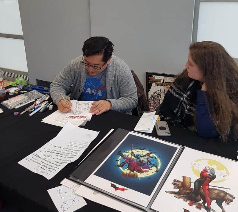 Abbiamo avuto la fortuna di conoscere Alex Alice, incredibile artista francese capace di mutare stile con inusuale capacità, a seconda del tono dell’opera (memorabile il suo lavoro dedicato a Wagner). Magnifico vedere il talentuoso Simone Bianchi realizzare pezzi incredibili, tra oli, acquarelli, pastelli e perfino asciugacapelli! Bello osservare Adam Hughes e moglie lavorare in coppia, il primo alla matita e la seconda ai colori. Frank Cho è un uragano di simpatia e di gentilezza, davvero unico. Infine, un momento surreale è stato vedere un visitatore tirare fuori, di fronte ad uno stupefatto Bill Sienkiewicz, la celebre tavola di Amore e Guerra con Kingpin in tutto il suo struggente ed amaro dolore. Ecco, la fusione tra artista e opera, tra originale e mano creatrice è tutta qui, all’ombra del lago di Como.
