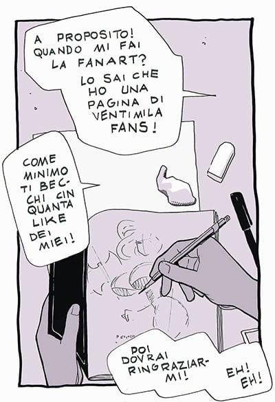 La tua storia, L’importanza dell’immagine, è un’amara riflessione sulla presenza ingombrante e sullo strapotere degli youtubers in contesti fieristici un tempo dedicati esclusivamente al fumetto. Ha anche senso, oggi e in questo clima, mettersi in gioco facendo il fumettista o cercare di diventarlo?
