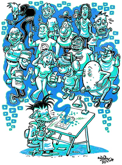 Dipende. Magari non per quanto riguarda l’aspetto fisico: il fumettista tende ad ingobbire, perdere la vista ed esporsi poco ai raggi solari. Per quanto concerne ciò che comunicano va detto che le due categorie utilizzano mezzi per esprimersi completamente diversi, il fumetto non è immediatamente fruibile da chiunque, richiede al lettore una certa alfabetizzazione ed è un oggetto tangibile che viene curato in ogni dettaglio; fare i fumetti poi richiede tempo, anni di pratica e di studio, poi la documentazione, la costruzione di storie, mondi, personaggi… È un lavoro da scriba egizio, da monaco amanuense miniatore, realizzato con strumenti e tecniche che si sono evolute con la civiltà umana usate per ottenere un prodotto da leggere e conservare, collezionare. Mentre per fare video su internet bastano una webcam e un microfono o addirittura uno smartphone. È una comunicazione immediata che la tecnologia moderna consente e che chiunque può mettere in pratica, e funziona se chiunque la può comprendere rapidamente. Si serve dell’attualità, dei trend del momento, è un prodotto della società dei consumi e, per quanto possa essere valida, temo che altrettanto rapidamente venga dimenticata.