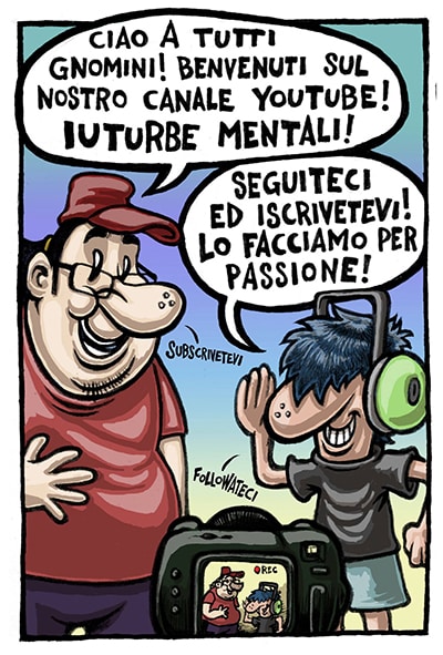 Non ho dovuto scegliere uno schieramento, il fumetto è il linguaggio che più amo in assoluto da sempre, come fruitore prima ancora che come disegnatore e autore. Sapevo dal principio per quale dei due fronti avrei parteggiato in questo conflitto, ma nell’affrontare l’argomento mi sono reso conto di avere una visione poco approfondita su ciò che è effettivamente il mondo degli youtubers. Nella storia che avevo cominciato a scrivere mi ero divertito a inventare due personaggi, parodie stereotipate degli youtubers medi: due giovani internettiani dai nickname astrusi, ragazzi insicuri, annoiati e desiderosi di una rivalsa sociale (o social). Uno più riflessivo, nerd e fumettofilo, l’altro più scalpitante e desideroso di diventare una celebrità. Contemporaneamente al disegnare la storia Iuturbe mentali presente nel volume mi sono infiltrato tra le file nemiche e ho quindi sviluppato e gestito Iuturbe Mentali il canale, realizzando le animazioni, le musiche, cimentandomi nell’editing video con la volontà di divertirmi a sperimentare diverse tipologie di video differenti, coinvolgendo anche nell’esperimento mio cugino, più giovane e più ferrato di me per quanto riguarda le tendenze youtubiche e soprattutto gran cazzeggiatore e dotato di un elevato potenziale umoristico. L’esperimento (che continueremo) mi ha dato modo di esplorare dall’interno il sorprendentemente vasto e variegato mondo degli youtubers e senz’altro questo sperimentare l’uso del mezzo ha influenzato quello che poi è stato il risultato finale, il mio personale contributo fumettistico a Fumettisti contro Youtubers. Che spero vi piaccia.