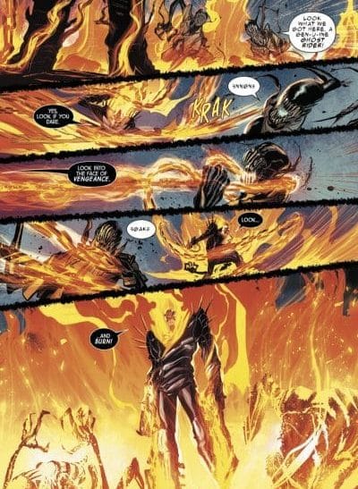 Avvolto da fiamme abbaglianti, lo spirito della vendetta sfoggia un aspetto fisico rinnovato, ispirato – come ammesso dall’artista – al dinoccolato Jack Skeletron di Nightmare before Christmas. La sua moto e le sue catene nere sono letali per i nemici e solcano le vignette visivamente più potenti, creando un piacevole contrasto con l’arancio brillante utilizzato dal colorista per accendere il fuoco. In generale, la lucentezza di molti sfondi mette in risalto le silhouette delle tante creature soprannaturali radunate nelle pagine.
