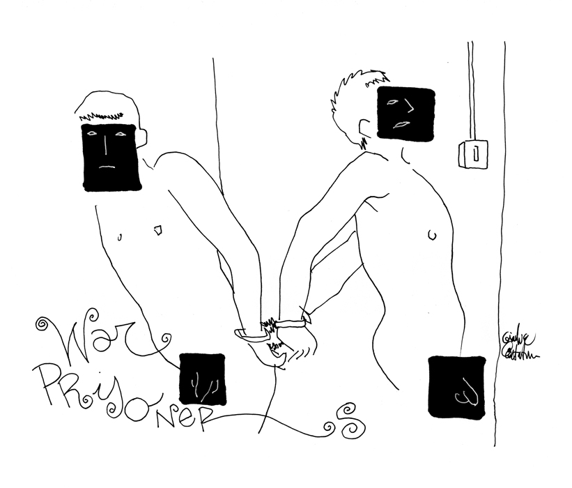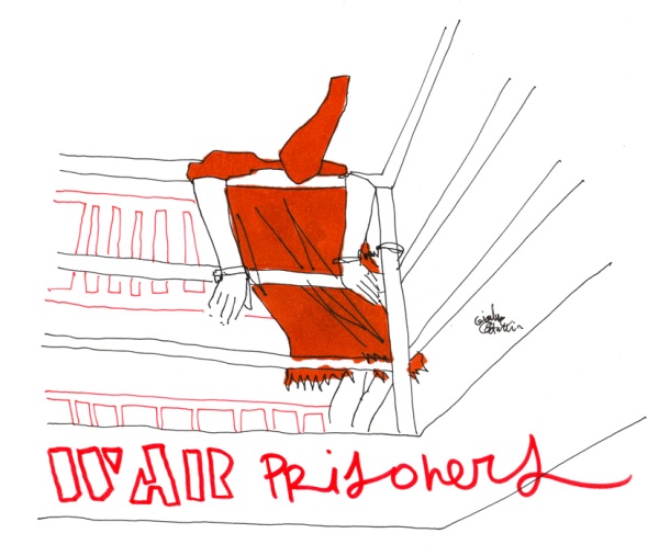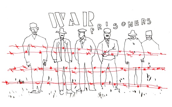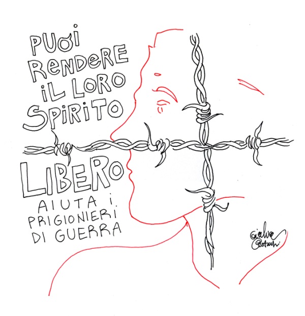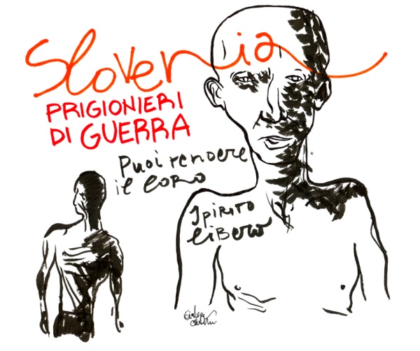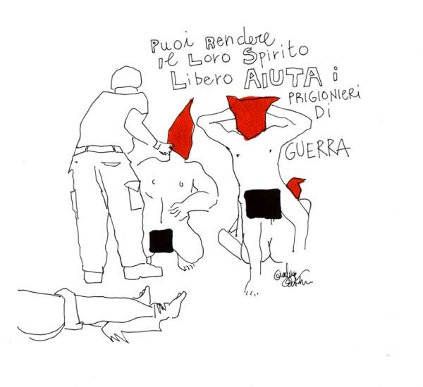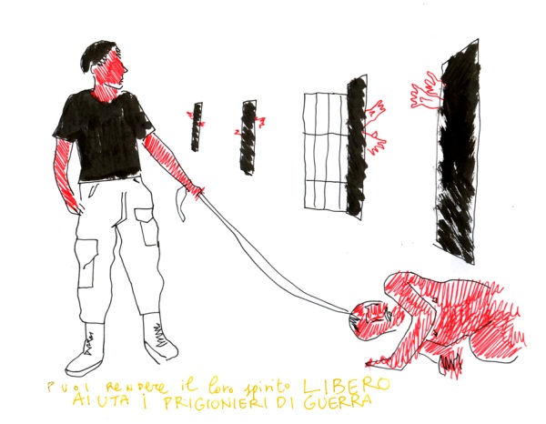Ho disegnato in diretta da dentro una cella, chiuso dietro le sbarre e non visibile direttamente dal pubblico se non mediante una telecamera che riprendeva le mani e i fogli per proiettarli su un grande schermo esterno. Ciò che accade all’interno di una cella non può essere difatti visto se non attraverso la mediazione. Anche se l’azione è innocua, come il disegno. All’esterno era presente anche un’installazione sonora fatta di voci e testimonianze di prigionieri di guerra.
