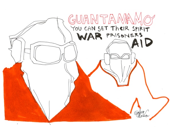 Questa è la mia prima improvvisazione artistica, mi sono preparato leggendo delle cose e soprattutto facendo una ricerca visiva di foto e poster sul tema della detenzione. Si va dalle torture di Guantanamo a quelle dei campi di concentramento nazisti, sempre molto simili purtroppo.