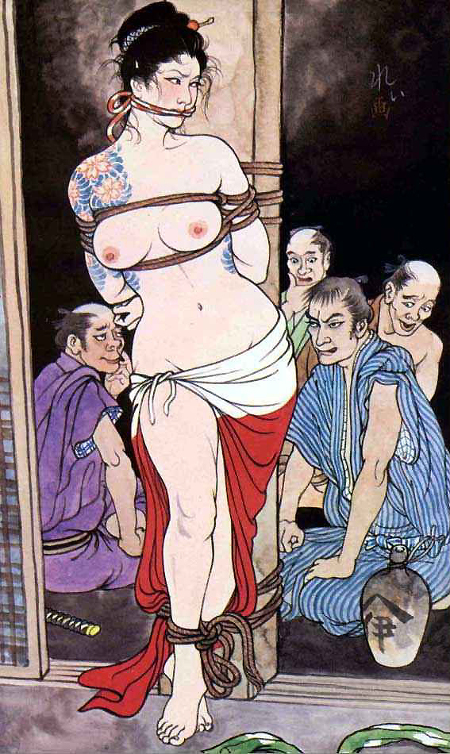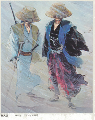 Le pellicole di tali registi sono tutt’ora per me dei punti di riferimento ogniqualvolta mi accingo a disegnare una sequenza con un paesaggio o in un interno; mi affido alle loro ricostruzioni storiche, alla loro messa in scena teatrale, come un bambino che si aggrappa alla mano sicura di un adulto. Ma come si dice “tutto il mondo è paese”, e non riesco a far finta di non sapere che qualcuno di questi mostri sacri si è pur preso qualche libertà nella rappresentazione, e non mi riferisco solo alla capacità di certe katane di fendere qualsiasi materiale. Ho pensato bene d’aver bisogno di una controprova e allora mi sono applicato alla raccolta di stampe giapponesi dei maggiori maestri, da quelli più conosciuti come Hiroshige, Hokusai o Yoshitoshi, fino ad arrivare ai più moderni, fautori dei cosiddetti shin-hanga, come Kawase Hasui o Hiroshi e Tōshi Yoshida. Ecco, a questo punto il passo verso l’illustrazione vera e propria è stato breve. Ho recuperato molti libri di autori giapponesi che hanno vissuto e lavorato durante le ere successive a quella Edo, fino al più vicino periodo Showa, scoprendo dei disegnatori eccezionali che ho sentito davvero molto vicini alla mia personale interpretazione stilistica. Naka Kazuya, Tatsumi Shimura, Oda Tomiya, Ito Hikozo, Iwata Sentaro o Do Shoichi ai più non diranno nulla, ma per me sono diventati una rete di sicurezza, perché di questa ho bisogno mentre lavoro, una serie continua di immagini a cui attingere al bisogno, non appena alzo lo sguardo dal foglio. Per questo tutt’intorno al mio tavolo da disegno c’è un intreccio fatto di fotogrammi di film, stampe antiche, illustrazioni moderne e appunti grafici su katane, sandali e kimono.