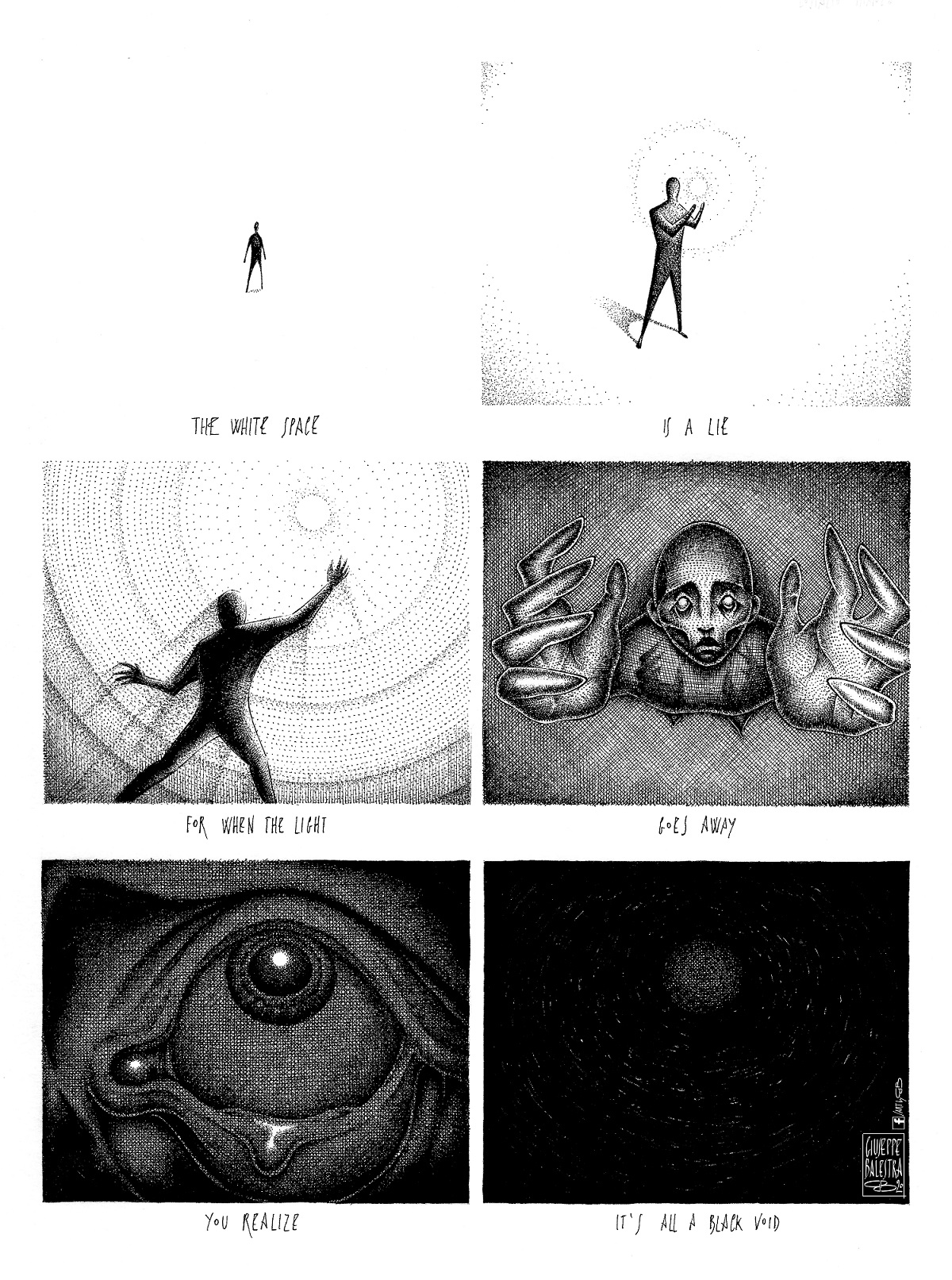 Giuseppe “GB” Balestra, illustratore autodidatta, 1991. Lavora principalmente usando pennini ad inchiostro, tratteggio e puntinismo, creando illustrazioni definite “melanconiche, misteriose e poetiche” in cui l’oscurità delle ombre si pone in contrasto alla luce.