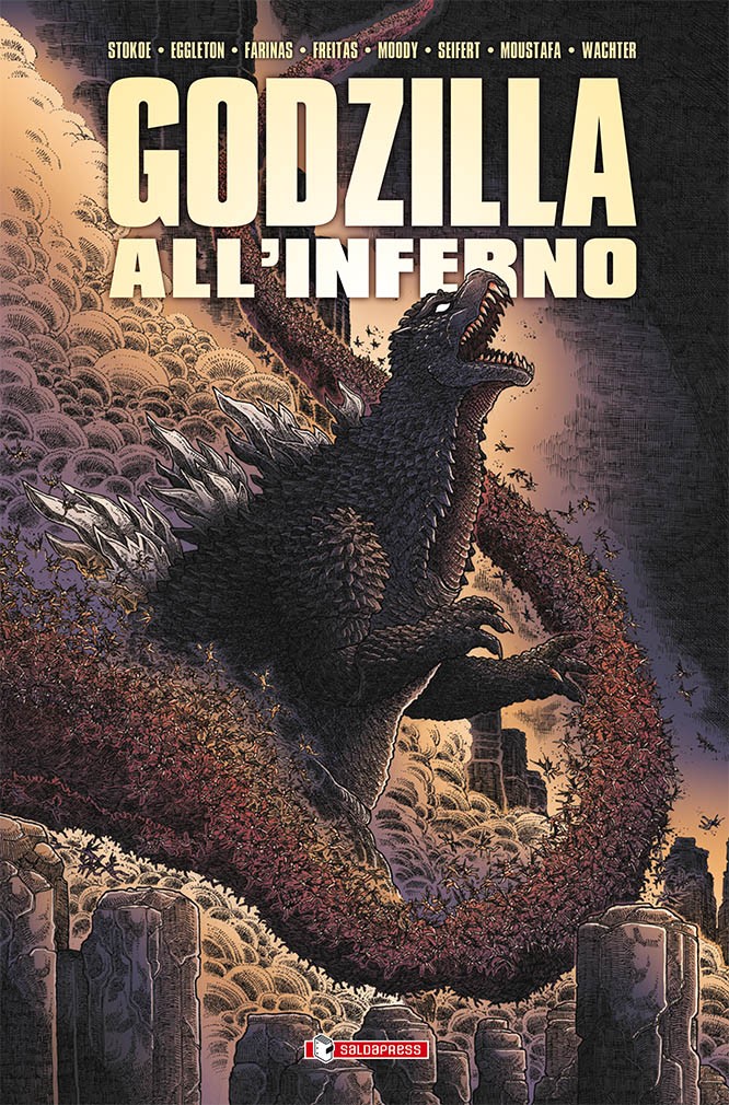 Questa volta si va all’inferno. E qui, in una struttura analoga a quella dei gironi danteschi, Godzilla incontrerà una dopo l’altra le versioni demoniache dei suoi nemici più famosi e pericolosi. Un viaggio immaginifico ed emozionante affidato a grandi talenti del fumetto USA tra i quali appunto James Stokoe, perfettamente a suo agio in questa originale e surreale rilettura infernale di Godzilla. Ad affiancarlo ci saranno Bob Eggleton, Ulises Farinas, Erick Frietas, Buster Moody, Brandon Seifert, Ibrahim Moustafa e Dave Wachter.