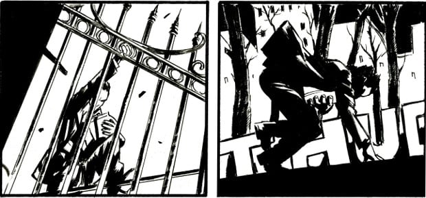 I chiaroscuri sono molto importanti, nelle vignette di Dell’Edera: tra ambientazioni notturne e luoghi chiusi, infatti, le ombre hanno una grande importanza nell’economia narrativa e i neri pieni abbondando quindi nelle tavole, bilanciandosi però bene per rendere sempre comprensibile la scena.