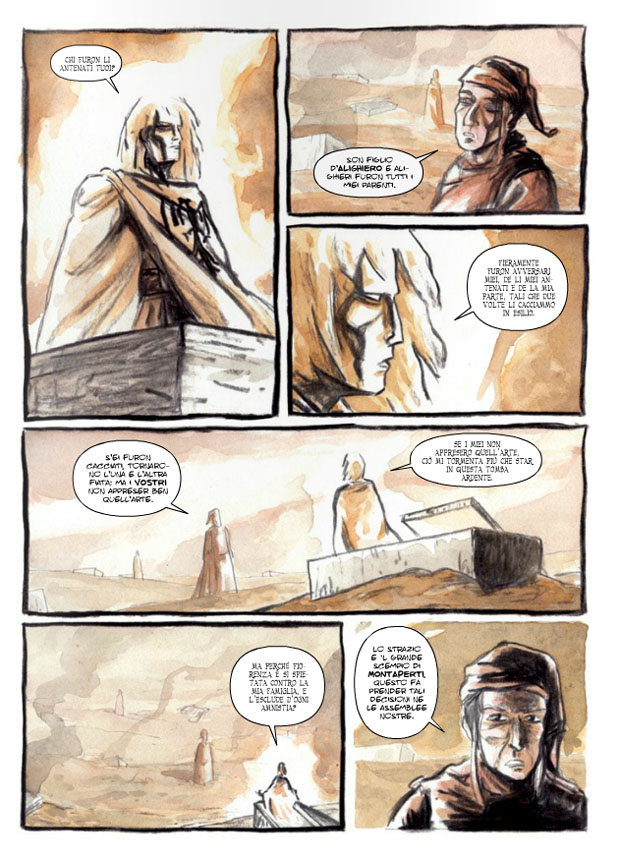 In una serie di tavole contrassegnate dal forte tratto pittorico dell’autore, nelle quali l’uso dell’acquerello si mischia con efficacia al tratto del carboncino, l’autore illustra il colloquio che intercorre tra Dante e Farinata e per mezzo di esso – attraverso una sequenza di flashback – ci mostra le fasi più salienti della vita del condottiero fiorentino, che culminano nella bella, cruda e violenta immagine a doppia pagina che ci mostra il campo di battaglia di Montaperti.