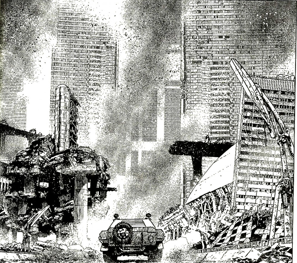Le qualità di Stefano Vietti qui esplodono in tutta la loro forza: lo sceneggiatore bresciano si è sempre trovato perfettamente a suo agio con questo genere di racconti, e la sua esperienza (maturata anche con la saga precedente, la Guerra con le Stazioni Orbitanti) lo porta a realizzare un albo altamente spettacolare ed efficace. Nonostante sia tutto azione e catastrofi, “Distruzione! ” non risulta assolutamente veloce da leggere, tutt’altro. Vietti riesce a far interagire molteplici situazioni umane sullo sfondo di una città violentemente stuprata, e di cui crediamo rimarrà ben poco dopo la fine di questa maxi saga.