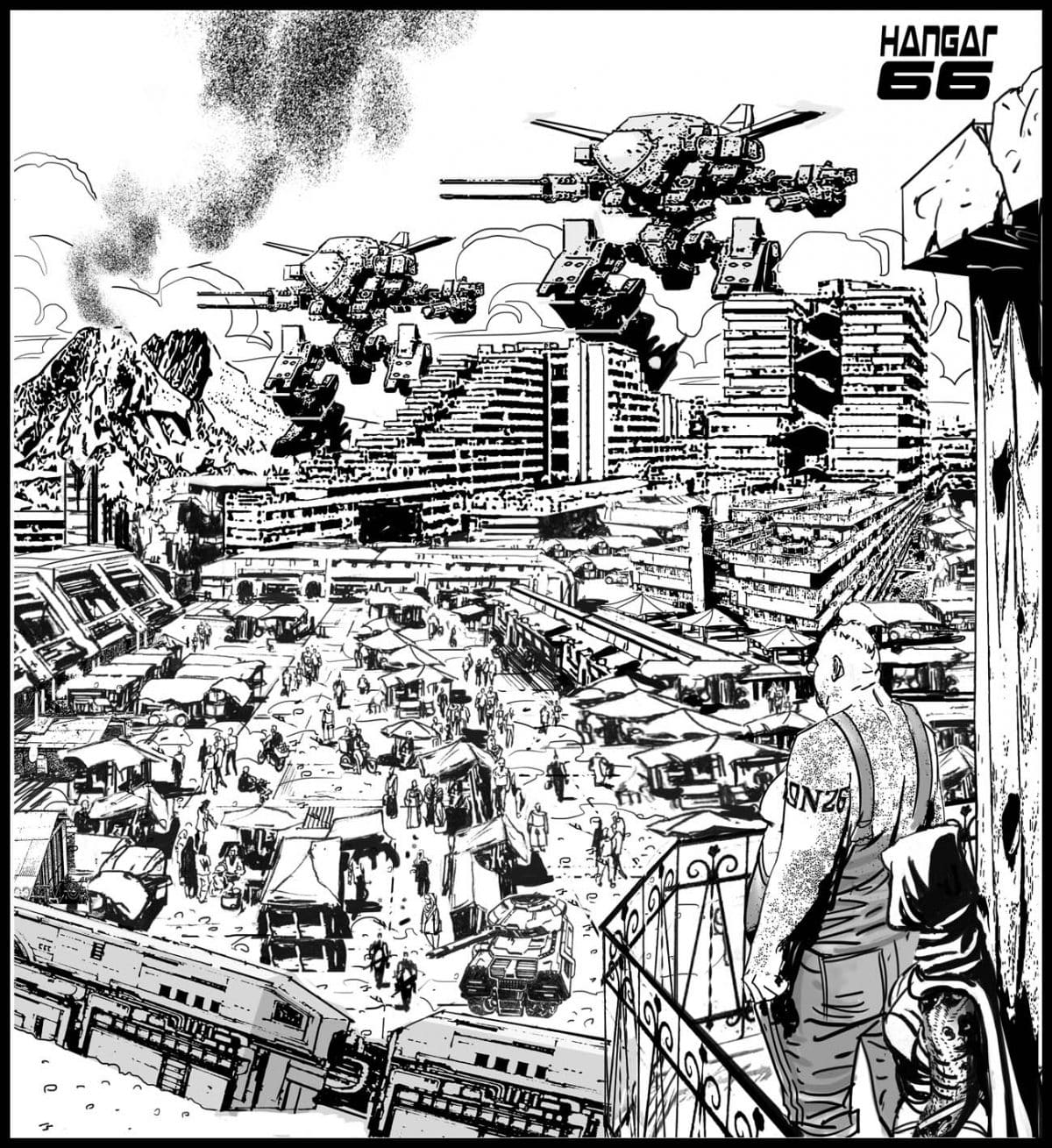 Ciao Michele, grazie a te! Hangar 66 è il primo social-comic della storia del fumetto e nasce dal mio desiderio di creare un fumetto indipendente da ogni logica editoriale, completamente libero nei contenuti e nella grafica. Volevo esprimermi al massimo senza lacci di nessun tipo, disegnare quello che mi piaceva, come mi piaceva, punto. Ma prima ancora di cominciare a disegnare, ho fatto una semplice domanda ai miei followers su Facebook: qual è il fumetto che avreste sempre volute leggere e che non avete ancora visto? Le risposte che ho avuto andavano tutte nella stessa direzione, che incredibilmente era quella che avevo già in mente io, quella che vedrete appunto in Hangar 66.