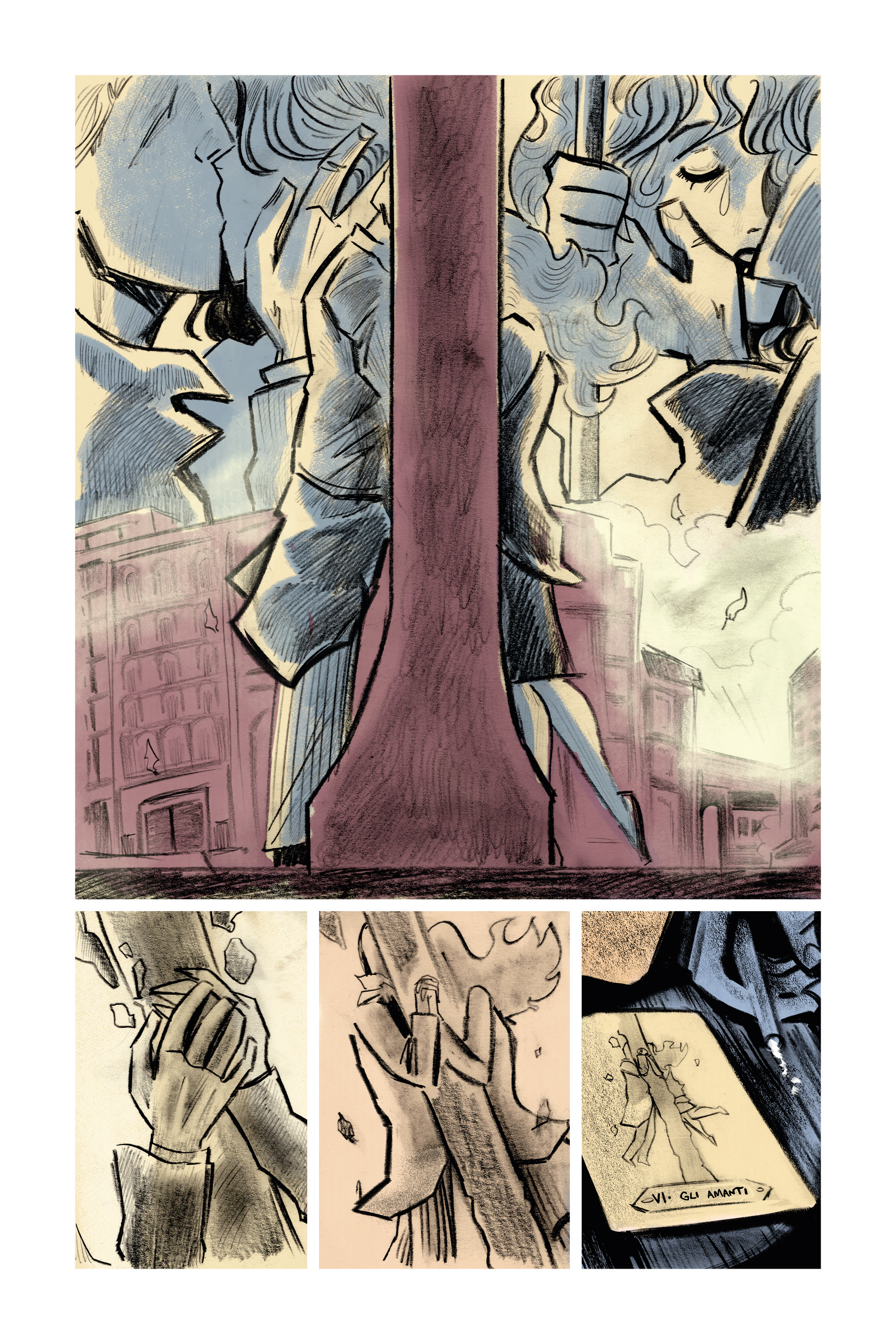 Mattia Tassaro fornisce forse, sin qui, la sua prova migliore sia al disegno che nell’utilizzo dei colori. il suo tratto, dalle forti influenze americane, che ricorda nello stile autori come Darwyn Cooke e Michael Avon Oeming, seppur più stilizzato, si adatta bene alla scrittura di Coltellacci, scomponendo e ricomponendo la tavola come un vero e proprio mosaico pronto a ospitare la moltitudine di personaggi e luoghi che la narrazione ospita, anche se si avverte un bisogno di maggior differenziazione nella resa dei volti, a volte troppo simili.