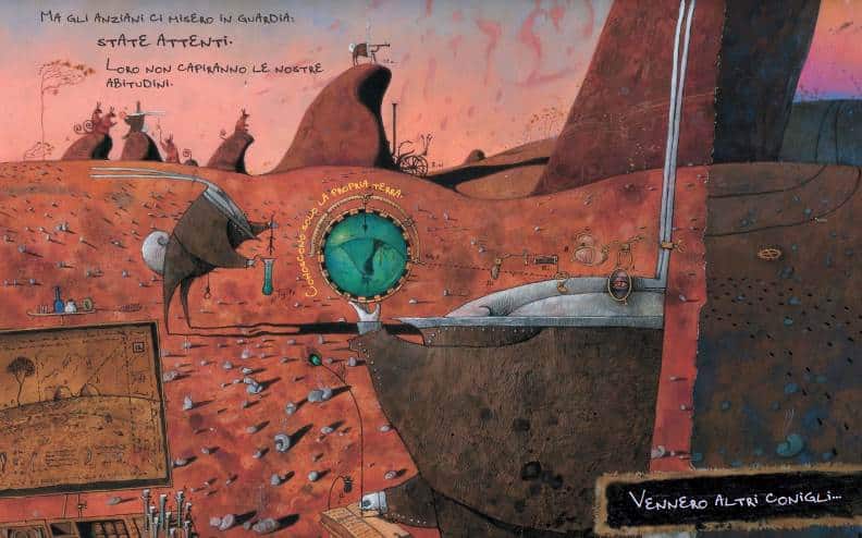 Dai testi di John Marsden e dal pennello di Shaun Tan, I conigli è una favola dai toni amari che richiama da subito alla mente l’invasione occidentale nei confronti degli aborigeni australiani, ma che facilmente si adatta a quella subita dagli indiani d’america o ancora dalle popolazioni sudamericane.