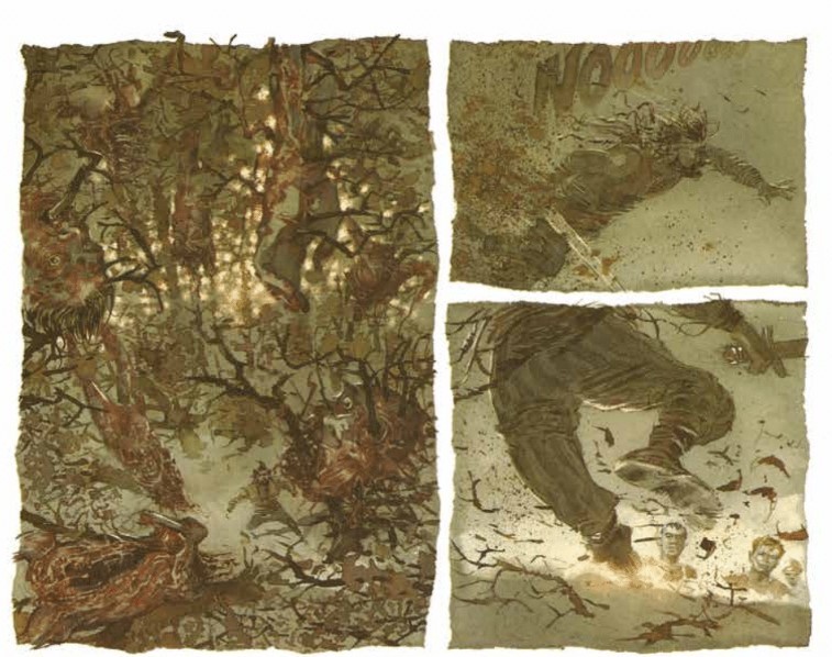 La leggenda: ma è una spiegazione che lascia insoddisfatti gli astanti, che ben conoscono la leggenda di come Ducario abbia richiamato gli spiriti guerrieri sopiti negli alberi. Alberi combattenti che, risvegliandosi, fecero letteralmente a pezzi l’esercito romano. Qui Tisselli dà mostra della sua maestria, proponendo creature orribili fatte di rami e scene macabre dove i corpi e le membra strappate dei soldati martoriati vengono letteralmente divorate dalle piante. La lovecraftiana foresta disegnata da Tisselli compare essa stessa come una creatura vivente, il cui volto mostruoso e famelico si forma tra le ombre dei rami.