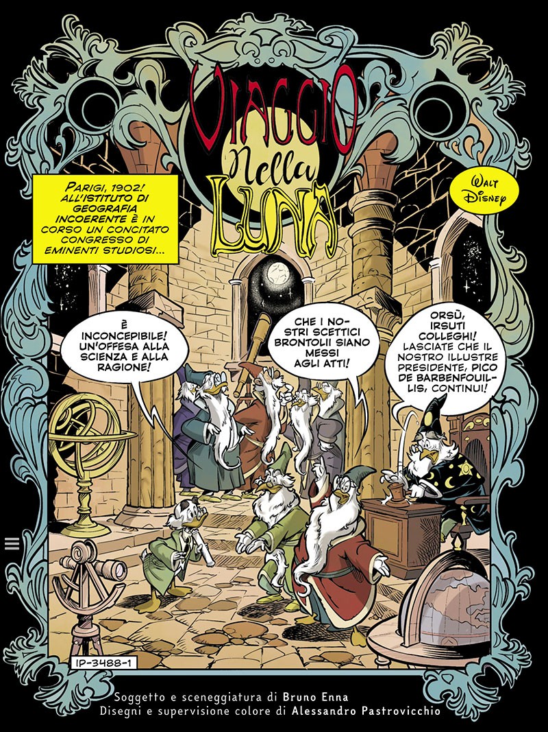 Ecco perché il direttore di Topolino aveva sollevato una serie di dubbi quando Alessandro Pastrovicchio aveva sottoposto alla sua attenzione l’idea di ridurre a fumetti una delle opere più celebri e fondative dell’arte cinematografica, ma certo oggi non così conosciuta presso il pubblico disneyano: Le Voyage dans la Lune di Georges Méliès del 1902, primo esempio di cortometraggio fantascientifico.