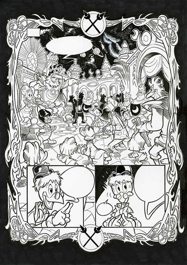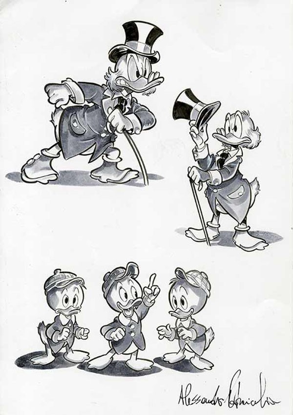 Efficace l’uso del cast dei personaggi, tutti pienamente calati nella parte loro assegnata e scritti con precisione e rispetto delle loro tipiche caratteristiche dallo sceneggiatore. Merito anche della varietà e della flessibilità da cui si può attingere nel mondo Disney, come lo stesso Enna riconosce nella sua intervista a fine volume. Forse, se un appunto si può muovere, riguarda l’uso limitato di Qui, Quo e Qua che fondamentalmente svolgono un ruolo di sfondo rispetto agli altri personaggi: se il tempo su pagina è lo stesso o quasi degli altri, le loro battute sono poche ed esterne al procedere della trama.