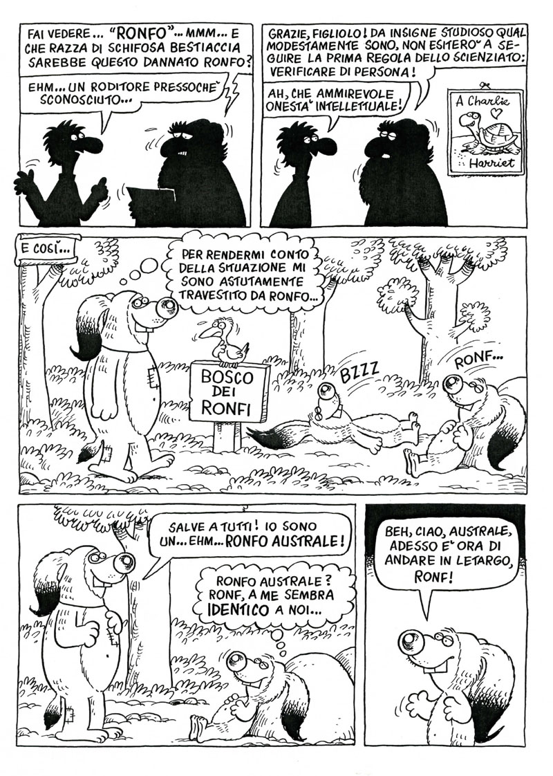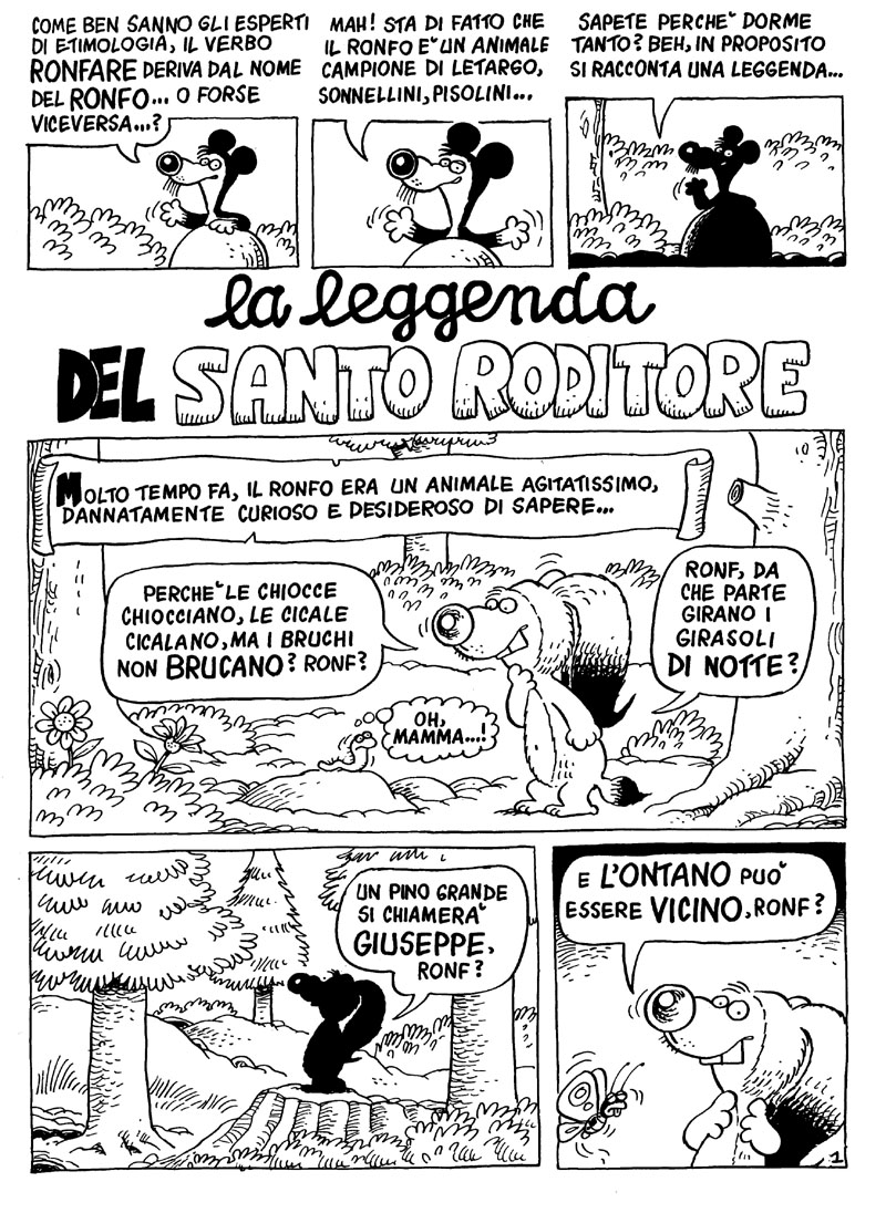 I Ronfi, i pigri roditori inventati da Adriano Carnevali, compaiono sul Corriere dei Piccoli nei primi anni Ottanta, trasportando i giovani lettori all’interno del loro bosco popolato da animali buffi e fin troppo umani. Le loro storielle rimangono impresse nella memoria di centinaia di migliaia di bambini, non solo per l’umorismo delicato, ma soprattutto per la viva intelligenza che ci sta dietro. Ogni episodio è l’occasione per l’autore per far riflettere su un tema importante, per mostrare la vita quotidiana da un’angolazione inedita, per prendere in giro – sempre bonariamente – i difetti degli esseri umani.