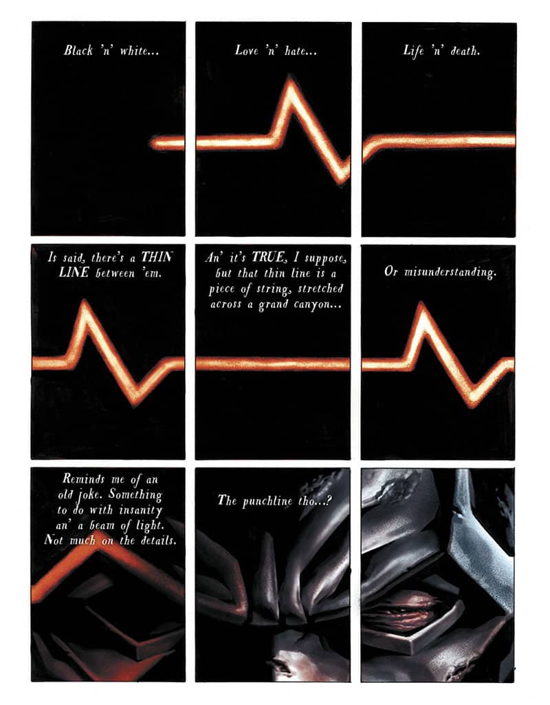 Lo stregone inglese svolge anche la funzione di voce narrante, con onnipresenti didascalie  che accompagnano il lettore durante tutto il volume. Queste danno modo di apprezzare la qualità della prosa di Azzarello, sebbene finiscano per risultare in alcuni frangenti un po’ ridondanti, appesantendo la lettura. Bisogna segnalare anche che tali stralci di testo, inseriti all’interno delle vignette senza venire incasellati in box di dialogo (uno stile analogo a quello utilizzato per la graphic novel Batman: Noel, della quale Lee Bermejo era autore completo), nonostante gli evidenti sforzi compiuti in fase di lettering per dare loro un posizionamento ottimale, alle volte arrivano inevitabilmente a confondersi con i disegni sottostanti, costringendo ad aguzzare la vista per essere compresi.