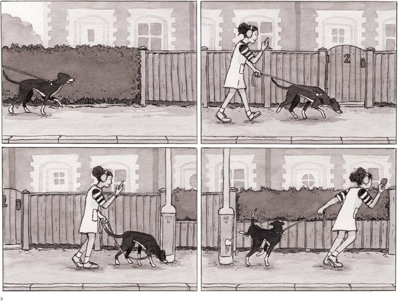 Non si tratta di un fumetto muto, ma poco ci manca. I dialoghi sono pochi ed estremamente radi e il fumetto presenta lunghe sequenze mute che indugiano su un rallentamento del tempo, anche quello di lettura. Persino i suoni non seguono i canoni: ci sono ma non vengono descritti e definiti da delle onomatopee. Sono elementi grafici che diventano parte stessa del disegno, un escamotage di grande effetto che troverà anche un peculiare compimento alla fine della storia.