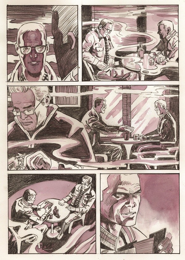 E’ Mario Gomboli a raccontarcelo: “Capita spesso, durante gli incontri tra fan e fumettisti, che qualcuno chieda a Giorgio Montorio un “disegnino con dedica”. Lui si dimostra sempre disponibile: prende carta e matita e traccia con sicurezza sul foglio le fisionomie di Diabolik, Eva o Ginko, a seconda delle richieste. Dopo pochi minuti il disegno sembra finito in tutti i dettagli, e invece… Invece Giorgio intinge l’indice nel bicchiere di lambrusco che ha – regolarmente – davanti, e usa il dito come fosse un pennello per tracciare ombre e evidenziare punti di luce. Con questa originale tecnica (raffinata quanto difficoltosa, che non ammette errori o ripensamenti) sono state realizzate le tavole della breve storia che avete appena letto. Il risultato è affascinante, anche in bianco e nero, ma qui vogliamo mostrarvi l’effetto cromatico, almeno in una vignetta, ricostruendole le fasi creative: schizzo preparatorio, matita e aggiunte del tocco di vino”.