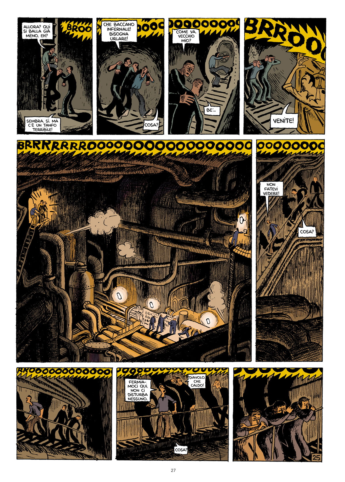 Discostandosi dal racconto realista della sua esperienza militare raccolto nei “Taccuini di un marinaio”, Blain ci conduce in un viaggio metaforico e inatteso, introducendo l’elemento fantastico nella sua narrazione per farla diventare maggiormente evocativa e farci avvicinare alla reale essenza della vita su una corazzata da battaglia. Un luogo invivibile, oscuro, puzzolente e rumoroso. Mantenendo una minima quota di realismo e un tono che incrocia il comico e il grottesco, l’autore realizza una miscela perfetta che gli consente di soddisfare in pieno l’esigenza di comunicarci il suo vissuto da marinaio.