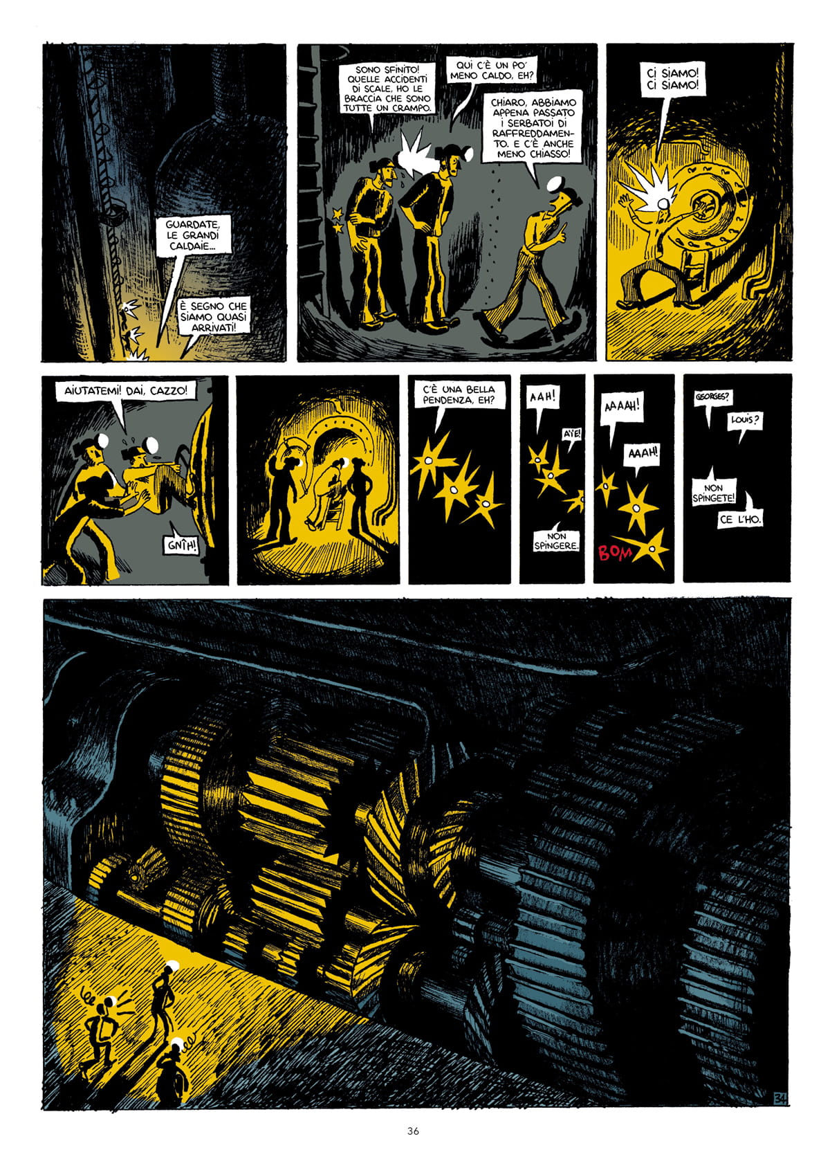 Il viaggio della corazzata è anche il viaggio degli uomini che la abitano, api frenetiche all’interno di un microcosmo sociale fatto di piccole cabine, incombenze giornaliere e rigide regole. In questa società chiusa e stratificata emerge il personaggio di George Guibert tramite il quale scopriamo l’ecosistema della nave che lega indissolubilmente al ristretto ambiente fisico i suoi occupanti. Uomini ritratti con linee essenziali, figure grezze e sgraziate nei movimenti, sghembe e barcollanti, utili a trasmettere l’idea di una profonda instabilità emotiva e relazionale che affligge l’umano. Esseri che, abbandonata la terra ferma, ricercano una nuova identità sociale nella ferrea gerarchia militare all’alba della seconda guerra mondiale. L’attesa del combattimento spinge i personaggi a un confronto con sé stessi, mettendone a nudo le personalità, le paure e le debolezze.
