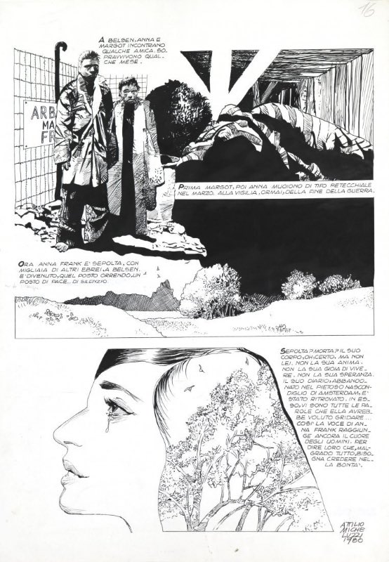 Ovviamente la maggiore attrattiva del volume è il poter godere – ancora una volta – dell’arte di Micheluzzi, con la sua elegante e inconfondibile linea chiara, la maestria compositiva e la capacità di destrutturare e liberare la gabbia del racconto a seconda di quello che sta narrando, restando sempre perfettamente chiaro e leggibile. Citiamo, a titolo di esempio, la splash page che apre la storia di Anna Frank, perfettamente rappresentativa del talento e della padronanza tecnica di Micheluzzi.